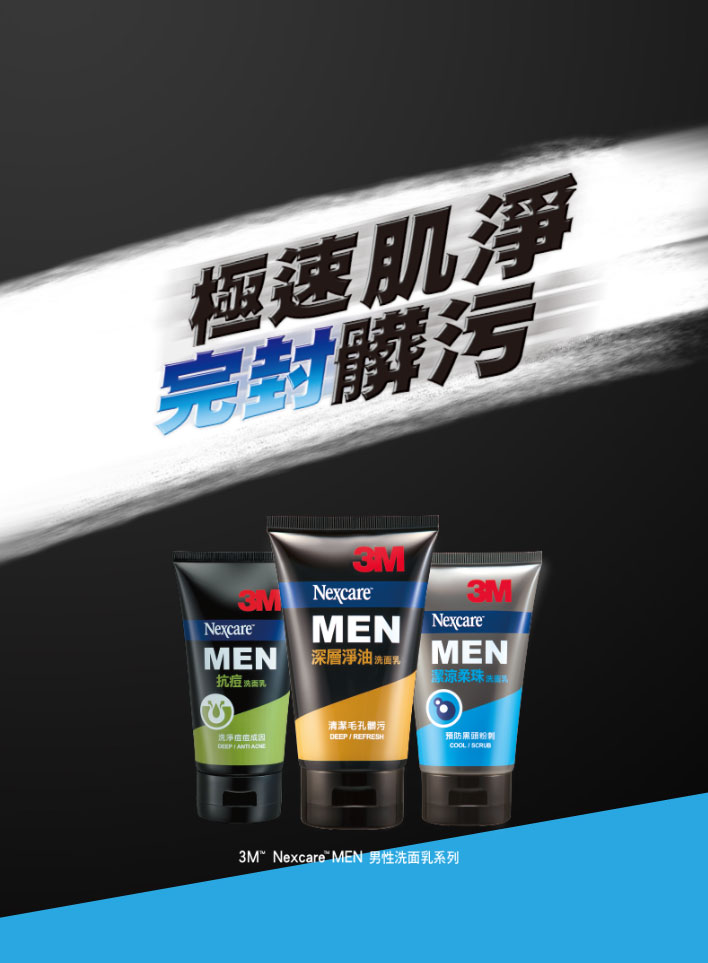 台灣的空氣總是讓男生的臉龐感到困擾,在旗下的洗面乳商品挑選三款「男性深層淨油洗面乳」於網站上推出,讓男性消費者不管在運動完、在外跑業務、都不用擔心臉上的髒污汗水,3M要讓你洗臉洗出清爽帥氣的臉龐!