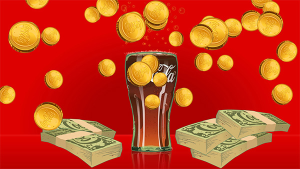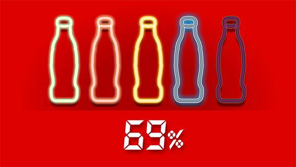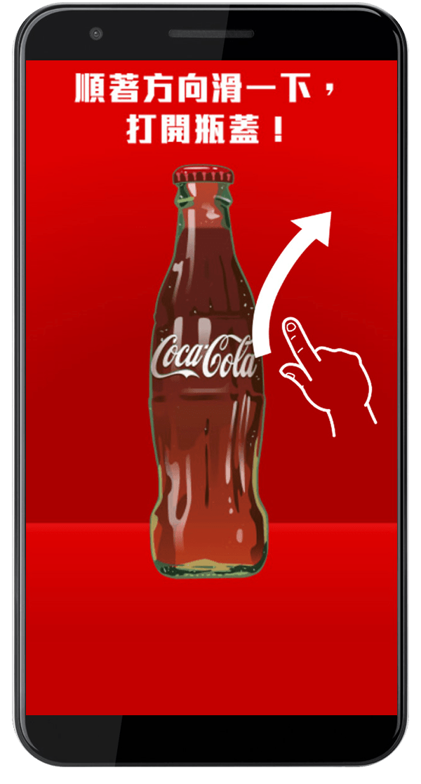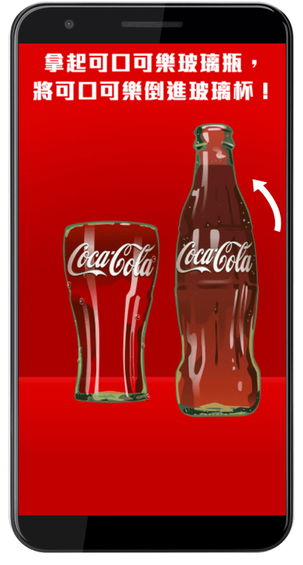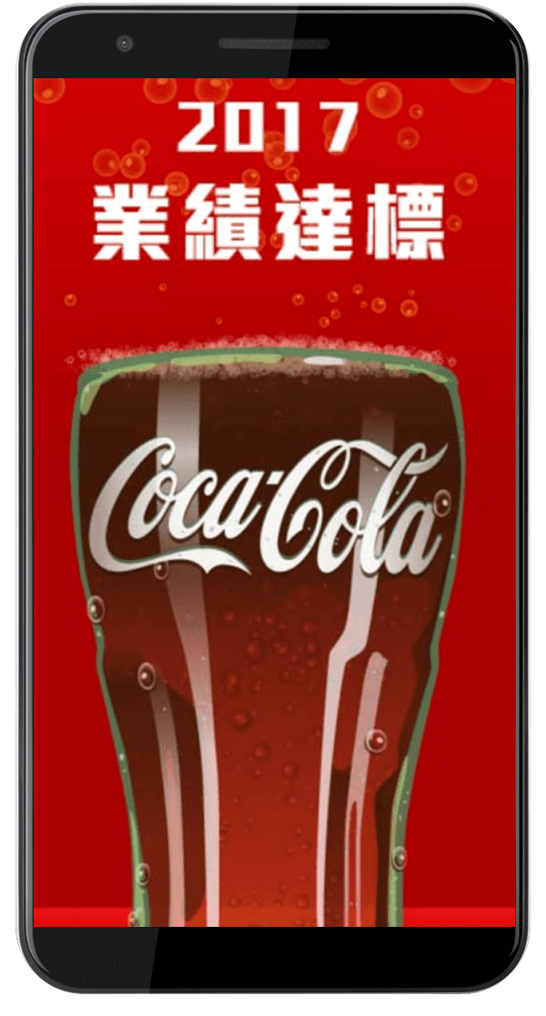 用可口可樂的 LOGO,瓶身設計、曲線瓶線條、象徵業績達標的金幣,做出 Mobile 的互動畫面及一系列的特效影片,USER 使用 Mobile 互動時,面前的兩個大螢幕同步在跑特效互動影片,讓現場操作的 USER 即時感受跨裝置多媒體互動。